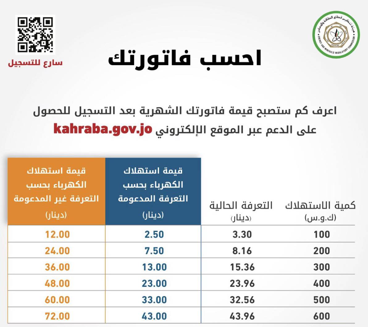 نشرت هيئة تنظيم قطاع الطاقة والمعادن جدولا يبين كم ستصبح قيمة استهلاك الكهرباء ، اذا تم التسجيل للحصول على التعرفة المدعومة.