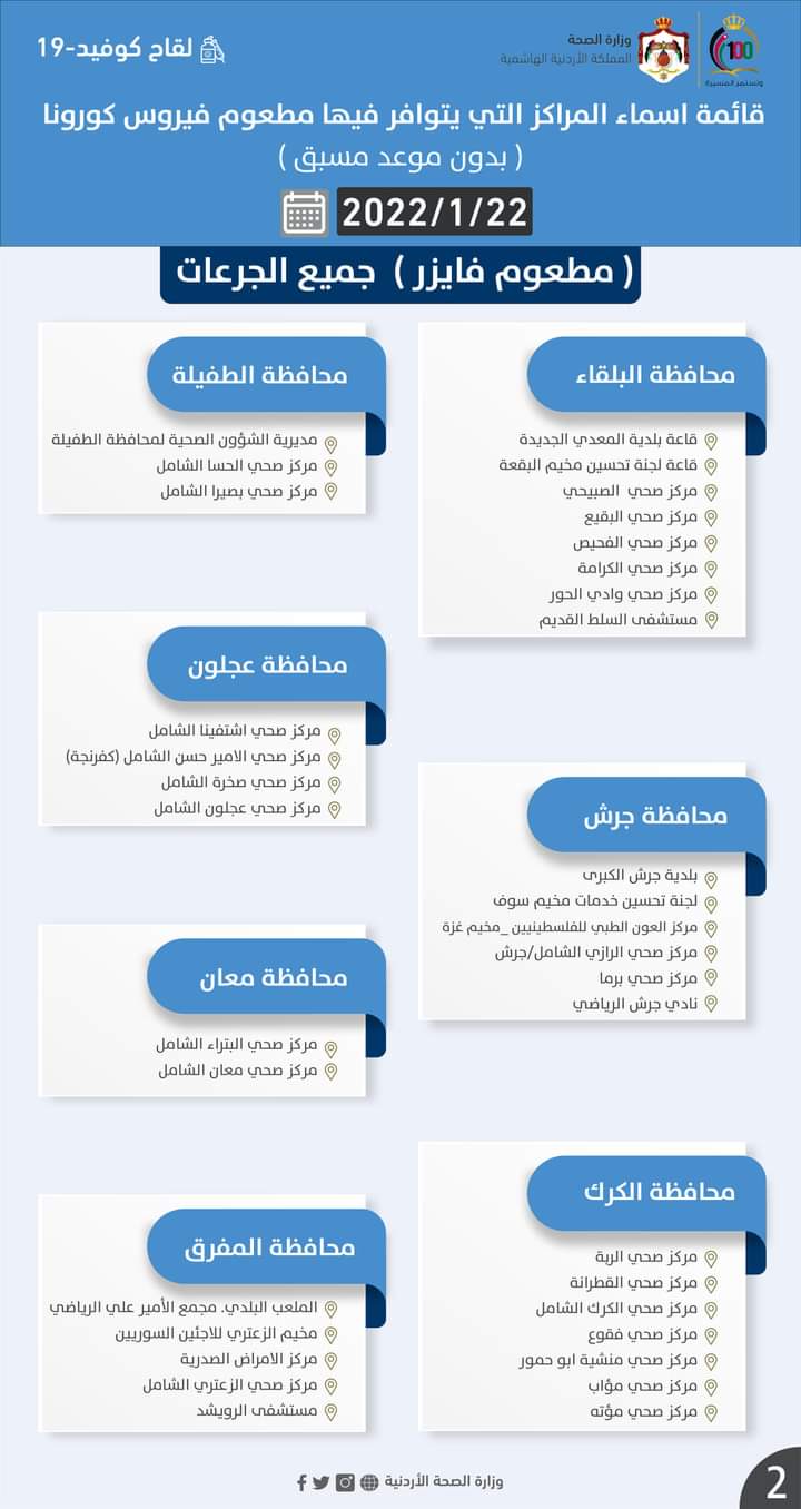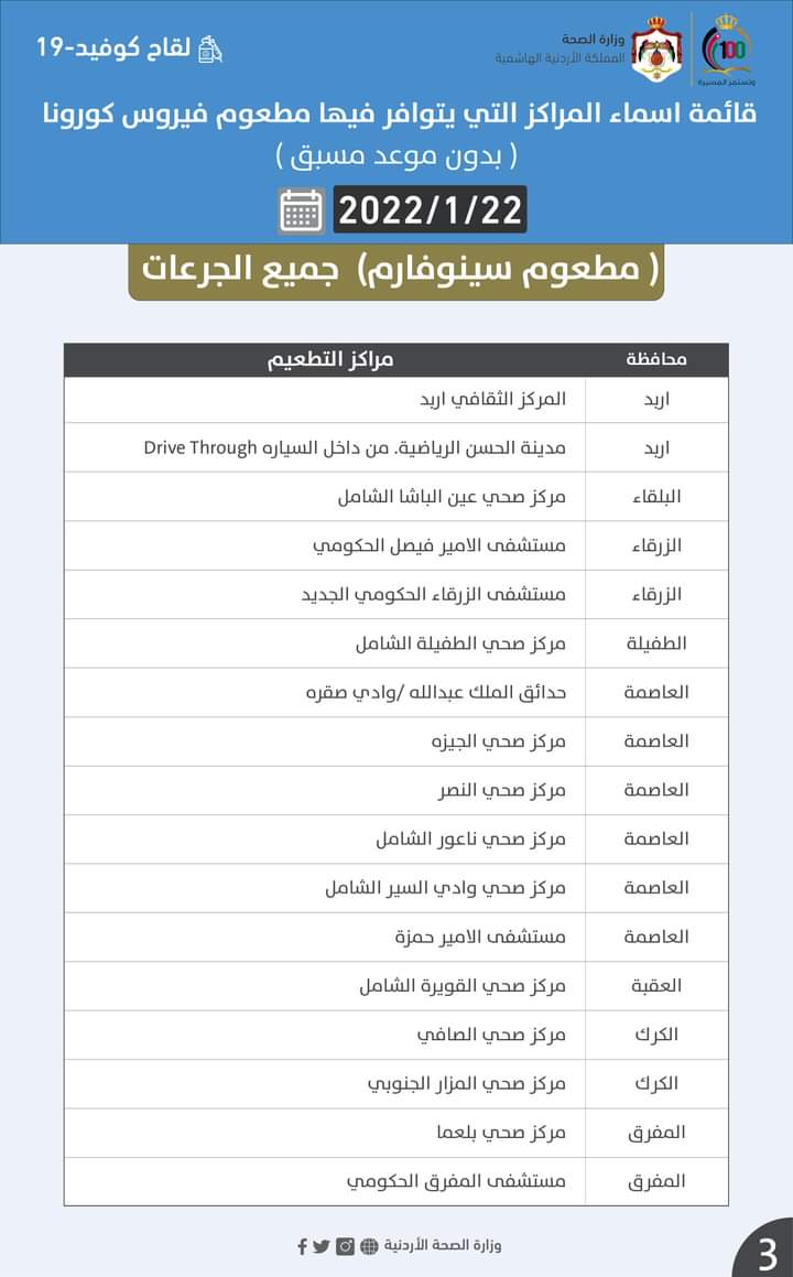 قائمة اسماء المراكز التي يتوافر فيها مطعوم فيروس كورونا (بدون موعد مسبق) جميع الجرعات ليوم السبت الموافق 2022/1/22: