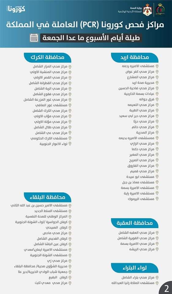 أعلنت وزارة الصحة قائمة مراكز فحص كورونا (PCR) العاملة في الأردن طيلة أيام الأسبوع المقبل ما عدا يوم الجمعة.