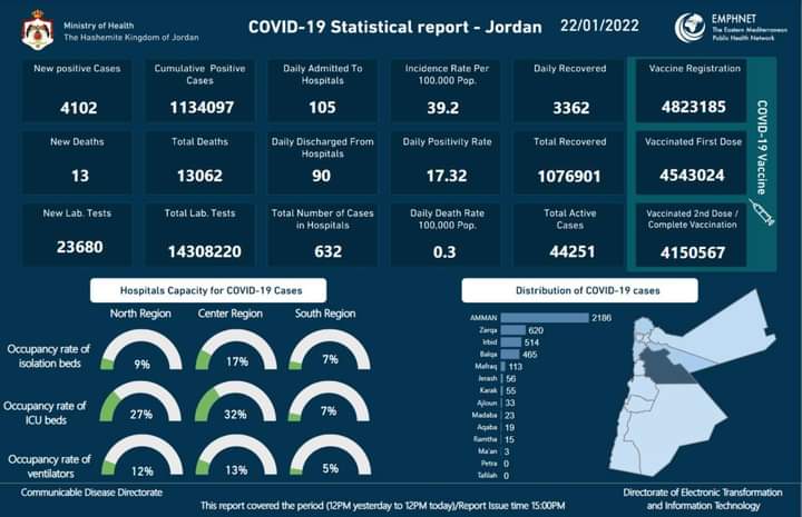 عاجل ..تسجيل 13 وفاة و 4102 اصابة جديدة بفيروس كورونا في الاردن