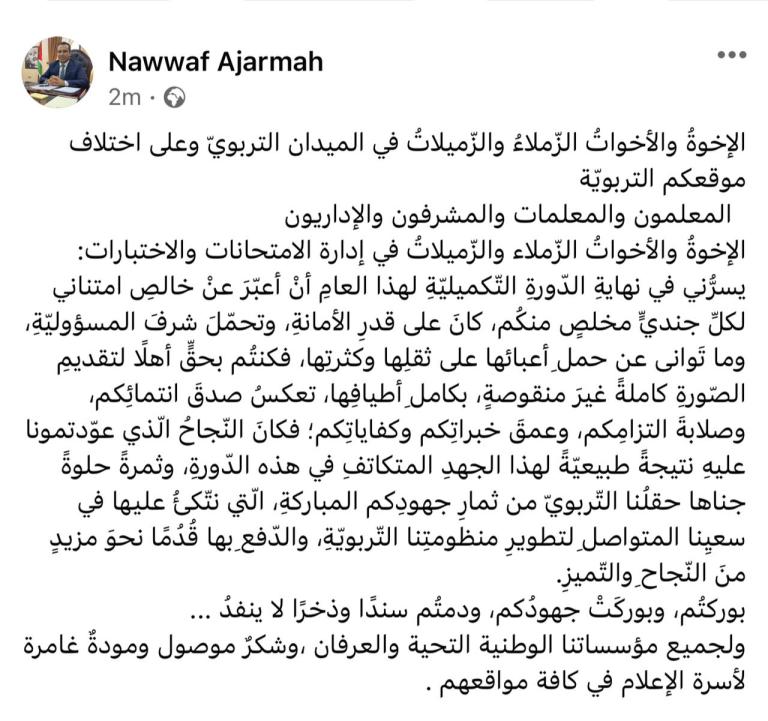 يسرُّني في نهايةِ الدّورةِ التّكميليّةِ لهذا العامِ أنْ أعبّرَ عنْ خالصِ امتناني لكلِّ جنديٍّ مخلصٍ منكُم، كانَ على قدرِ الأمانةِ، وتحمّلَ شرفَ المسؤوليّةِ، وما تَوانى عن حملِ أعبائها على ثقلِها وكثرتِها، فكنتُم بحقٍّ أهلًا لتقديمِ الصّورةِ كاملةً غيرَ منقوصةٍ، بكاملِ أطيافِها، تعكسُ صدقَ انتمائِكم، وصلابةَ التزامِكم، وعمقَ خبراتِكم وكفاياتِكم؛ فكانَ النّجاحُ الّذي عوّدتمونا عليهِ نتيجةً طبيعيّةً لهذا الجهدِ المتكاتفِ في هذه الدّورةِ، وثمرةً حلوةً جناها حقلُنا التّربويّ من ثمارِ جهودِكم المباركةِ، الّتي نتّكئُ عليها في سعيِنا المتواصلِ لتطويرِ منظومتِنا التّربويّةِ، والدّفعِ بها قُدُمًا نحوَ مزيدٍ منَ النّجاحِ والتّميزِ.
