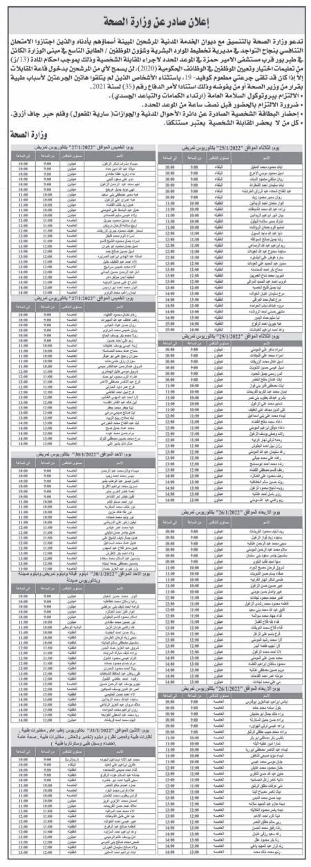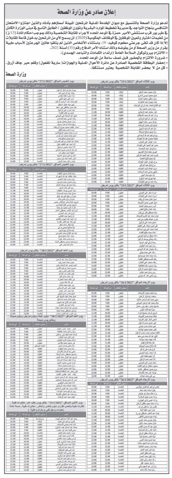 نيروز الإخبارية : دعت وزارة الصحة بالتعاون مع ديوان الخدمة المدنية، المرشحين ممن اجتازوا الامتحان التنافسي بنجاح، إلى مراجعة مبنى الوزارة لإجراء المقابلة الشخصية، تبعا للمواعيد المحددة أدناه.