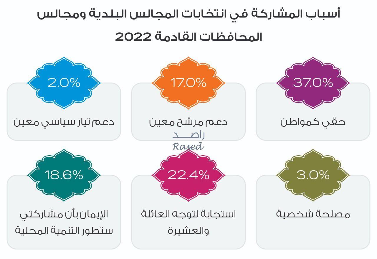 وبخصوص الأسباب التي ارتكز عليها المستجيبون الذين ينوون المشاركة، فقد تبين أن 37% قالوا بأنه حقهم كمواطنين هو الذي يدفعهم للمشاركة، 18.6% قالوا إنهم يؤمنون بأن مشاركتهم ستطور مسار التنمية المحلية، فيما قال 17% أن سبب مشاركتهم هو دعم مرشح/ة معين/ة، 22.4% قالوا بأن السبب الذي يدفعهم للمشاركة هو توجه العائلة أو العشيرة، وأورد ما نسبته 3% أن سبب المشاركة هو مصلحة شخصية تربطهم بالمرشح/المرشحة، وقال 2% أن سبب المشاركة هو دعم تيار سياسي معين.