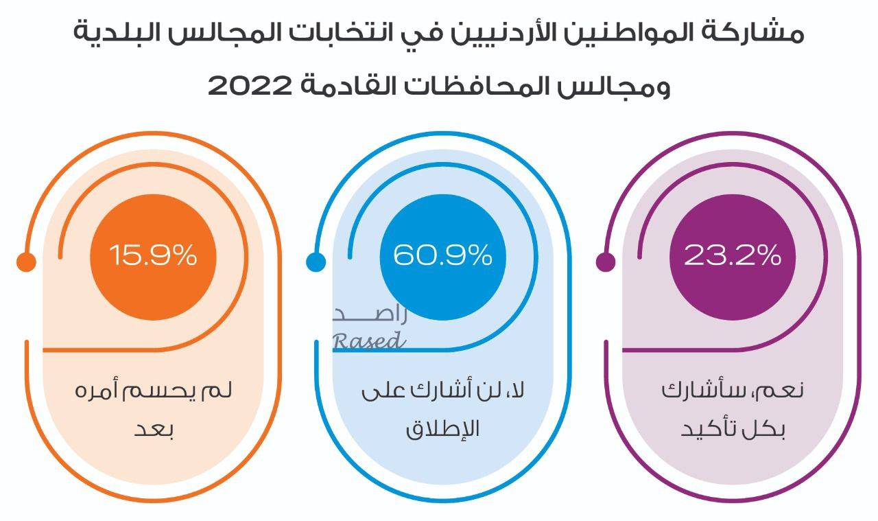 وبينت الدراسة أن 23.2% من الأردنيات والأردنيين ينوون المشاركة في الانتخابات البلدية، و 60.9% من الأردنيات والأردنيين لا ينوون المشاركة في الانتخابات المقبلة، أما الذين لم يحسموا قرار المشاركة من عدمها فقد وصلت نسبتهم إلى 15,9% من الأردنيات والأردنيين.