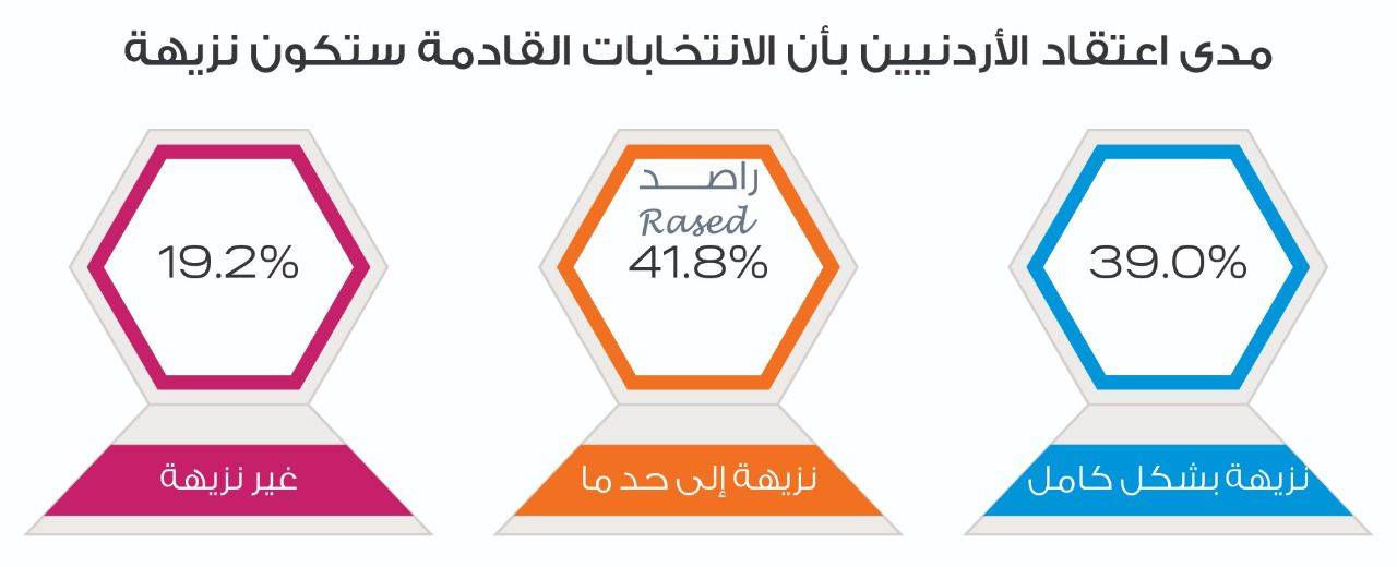وبخصوص رأي الأردنيات والأردنيين بنزاهة العملية الانتخابية، يرى 19,2% منهم أن الانتخابات لن تكون نزيهة، بينما يرى 41,8% أن الانتخابات ستكون نزيهة إلى حدٍ ما، بينما يرى 39% أن الانتخابات ستكون نزيهة بشكل كامل.