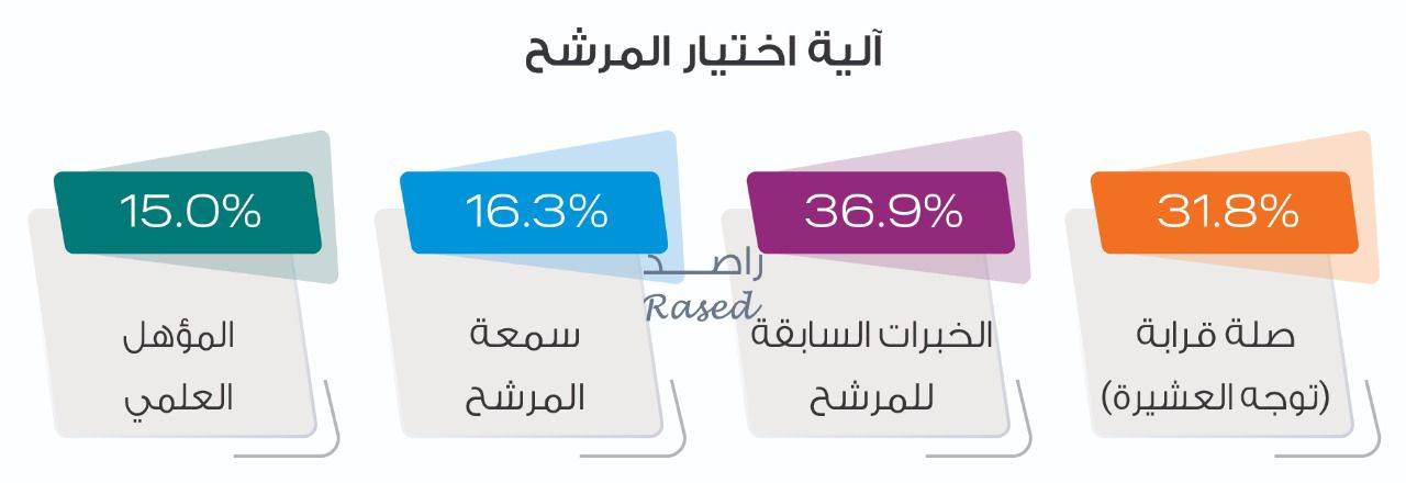 وبخصوص آلية اختيار المترشح أو المترشحة التي سيتم اختياره قال 36,9% أنهم سيختارون وفقاً للخبرات السابقة للمرشح/ة، فيما قال31,8% أنهم سيختارون بناءً على توجه عشائرهم، فيما قال ما نسبته 16,3% أنهم سيختارون المرشح بناءً على سمعته، وقال 15% أن المؤهل العلمي هو أساس اختيار المترشح/ة.