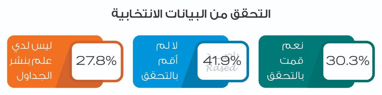 وأظهرت الدراسة أن 27,8% من الأردنيات والأردنيين ليس لديهم العلم بنشر جداول الناخبين، فيما وصلت نسبة الذين لم يتحققوا من بياناتهم على جداول الناخبين إلى 41,9% من الأردنيات والأردنيين، بينما كانت نسبة الذين تحققوا من بياناتهم الواردة في جداول الناخبين 30,3% من الأردنيات والأردنيين.