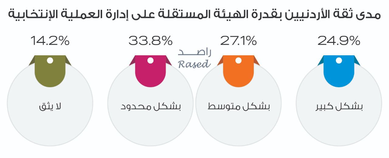 وفيما يتعلق بثقة الأردنيات والأردنيين بقدرة الهيئة المستقلة للانتخاب على إدارة العملية الانتخابية، قال 24,9% منهم أنهم يثقون بشكل كبير، بينما قال 27.1% أنهم يثقون بشكل متوسط، فيما قال 33,8% أن يثقون بشكل محدود، ووصلت نسبة الذين يقولون بأنهم لا يثقون بقدرة الهيئة إلى 14,2% من الأردنيات والأردنيين.