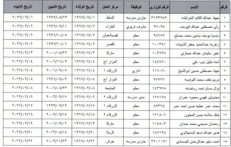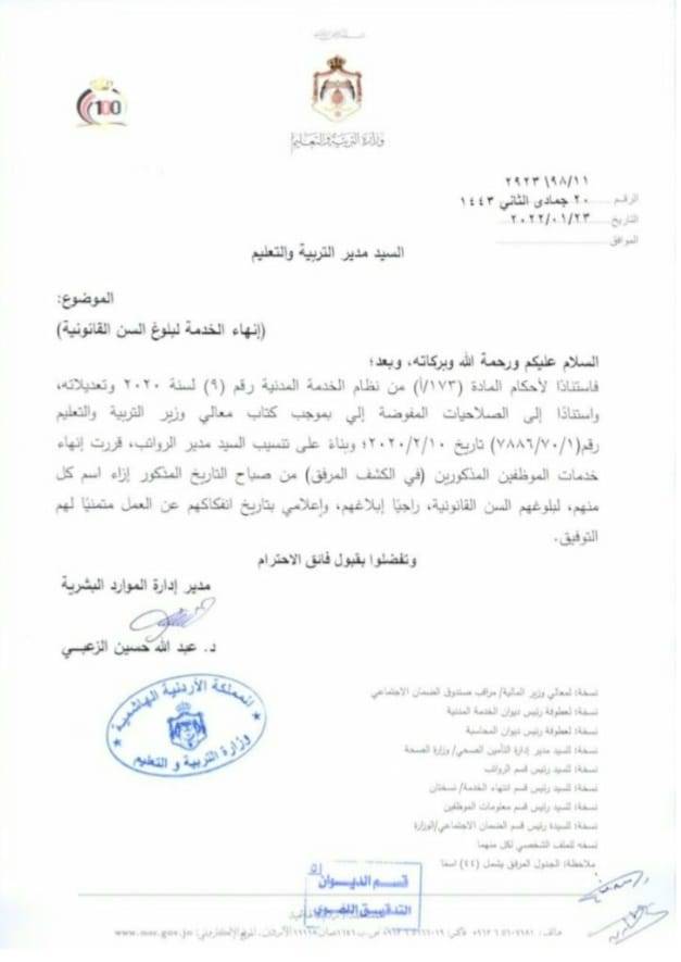 وبحسب تعميم صادر عن الوزارة، جاء القرار بالاستناد إلى المادة 15 من قانون التقاعد المدني رقم 34 لسنة 1959؛ وذلك بناء على طلبهم وبلوغهم السن القانوني.