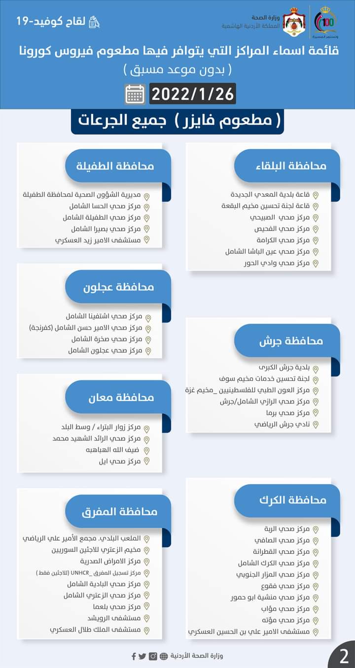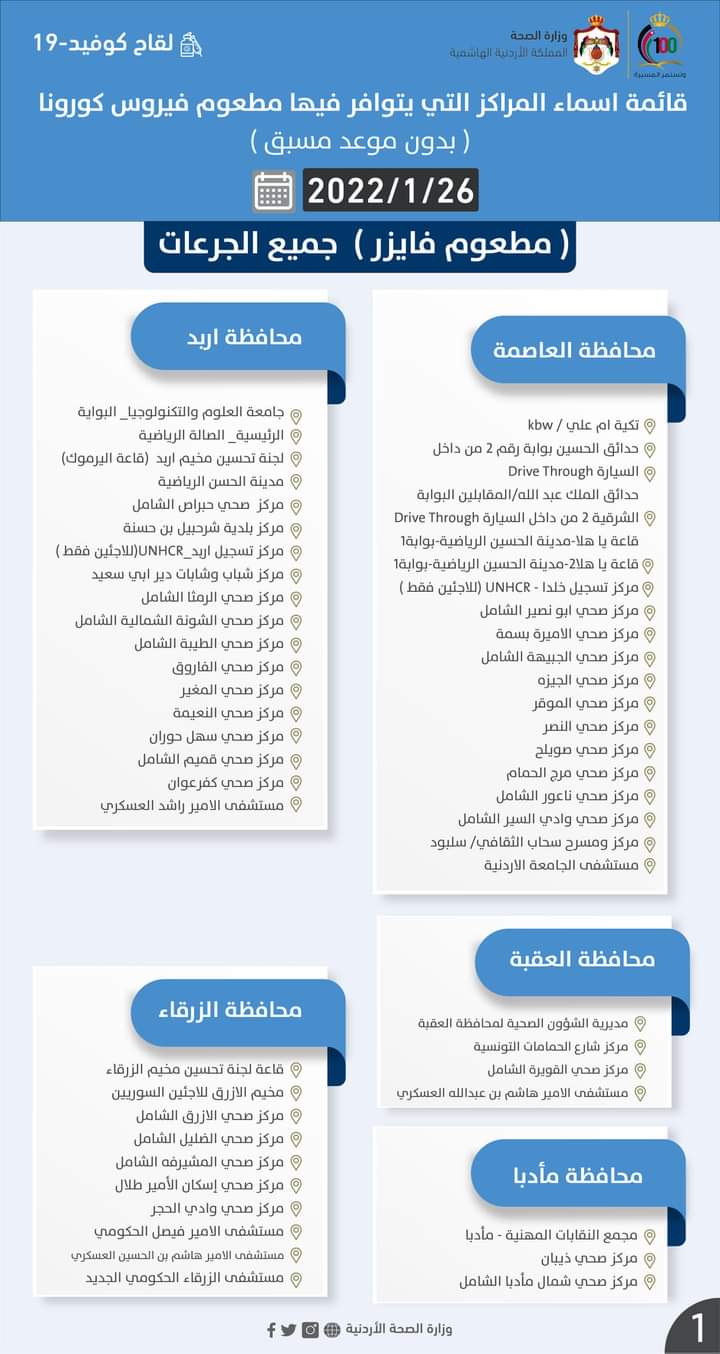 قائمة اسماء المراكز التي يتوافر فيها مطعوم فيروس كورونا (بدون موعد مسبق) جميع_الجرعات ليوم الاربعاء الموافق 2022/1/26: