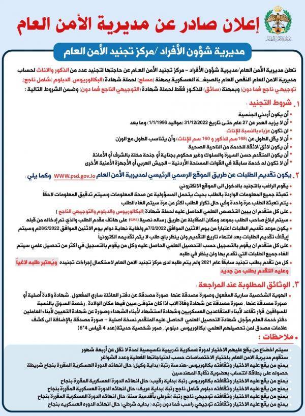 نيروز الإخبارية : أعلنت مديرية الأمن العام، الأحد، عن فتحها باب التجنيد، للذكور، والإناث، من حملة شهادات البكالوريوس، والدبلوم والتوجيهي ناجح فما دون، ومهنة سائق.