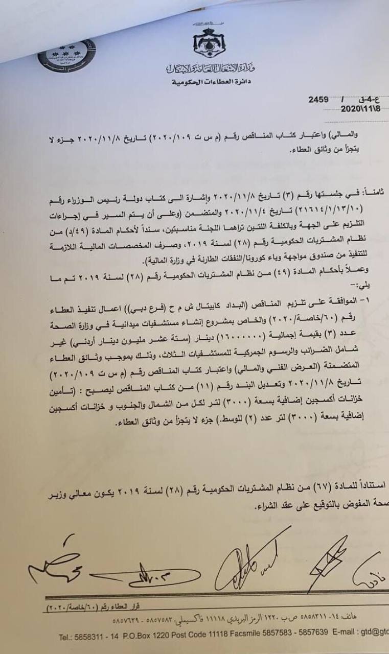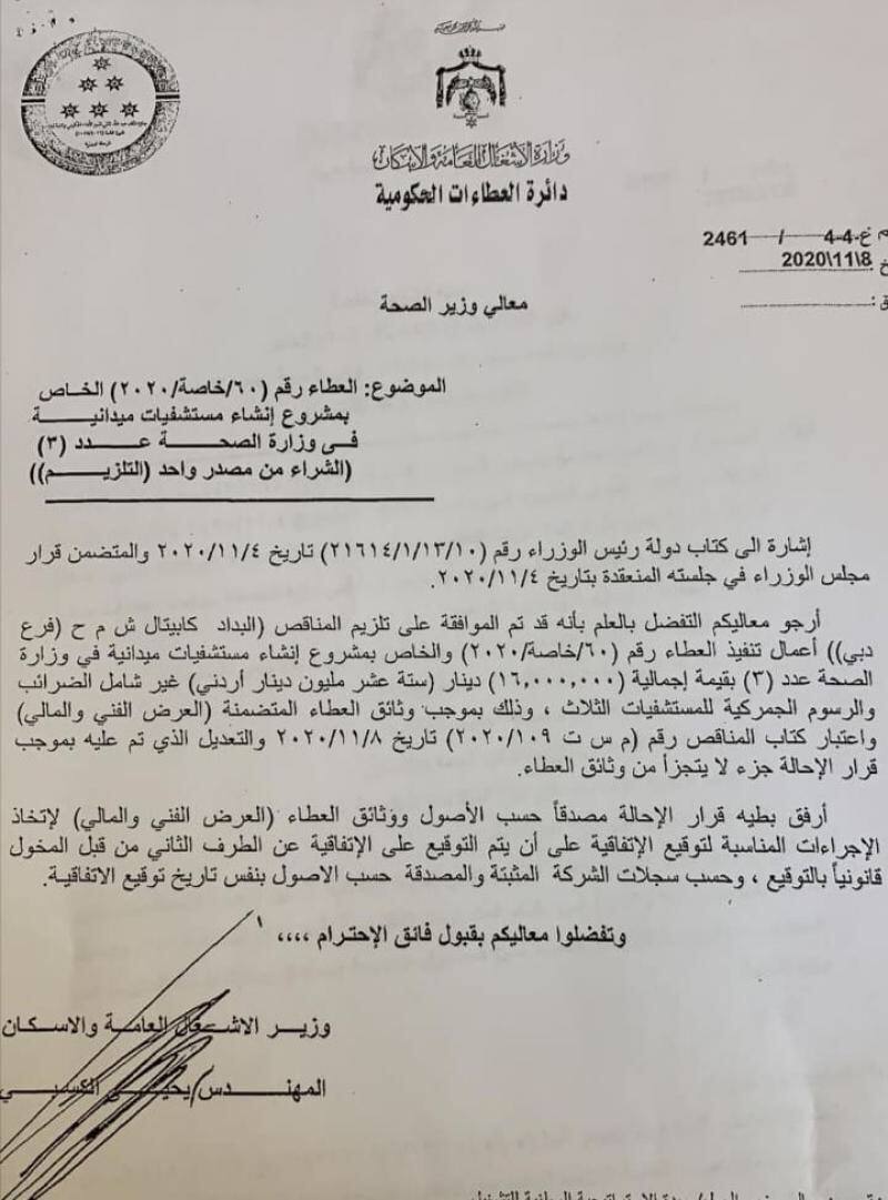 وحسب وثائق رسمية ، تبين أن عطاء إنشاء المستشفى تم بالتلزيم لإحدى الشركات دون طرح مناقصة أو الإعلان وفق ما تقتضيه طبيعة الحال.