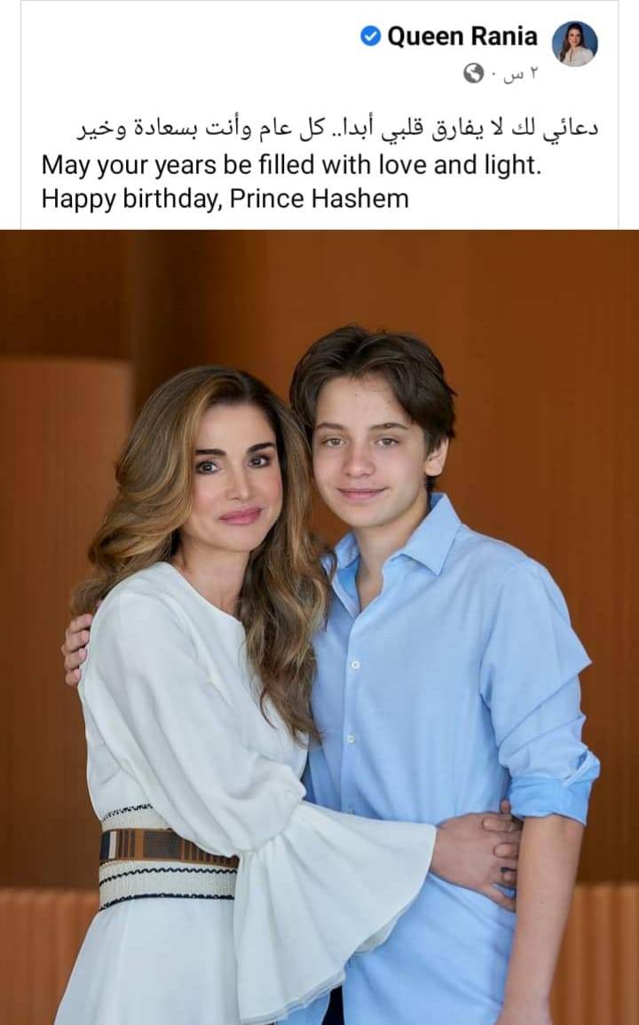 حيث نشرت جلالتها عبر حسابها الشخصي على الفيسبوك صورة لجلالتها برفقة نجلها الأمير هاشم مرفقة بنص " دعائي لك لايفارق قلبي ابدا ... كل وعام وانت بسعادة وخير ”.