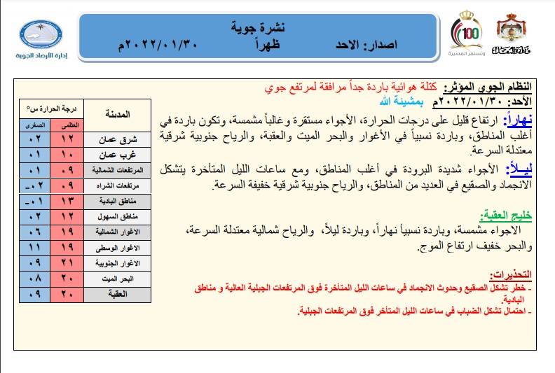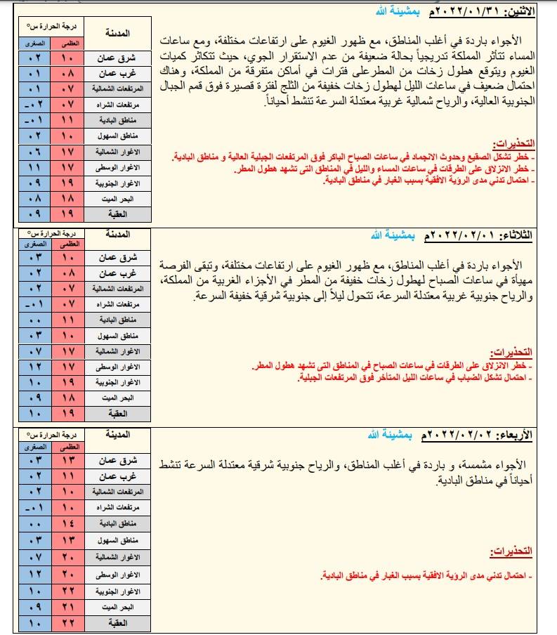 قالت الارصاد الجوية بأن الحالة الجوية ستشهد ارتفاعاً قليلاً على درجات الحرارة، وستكون الأجواء مستقرة وغالباً مشمسة، وتكون باردة في أغلب المناطق، وباردة نسبياً في الأغوار والبحر الميت والعقبة، والرياح جنوبية شرقية معتدلة السرعة. ليــلاً: الأجواء شديدة البرودة في أغلب المناطق، ومع ساعات الليل المتأخرة يتشكل الانجماد والصقيع في العديد من المناطق، والرياح جنوبية شرقية خفيفة السرعة.