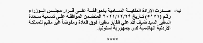 نيروز الإخبارية : صدر في عدد الجريدة الرسمية اليوم الثلاثاء، الارادة الملكية السامية بالموافقة على قرار مجلس الوزراء المتضمن الموافقة على تسمية السفير ضيف الله علي الفايز سفيرا فوق العادة ومفوضا غير مقيم للمملكة الأردنية الهاشمية لدى جمهورية استونيا.
