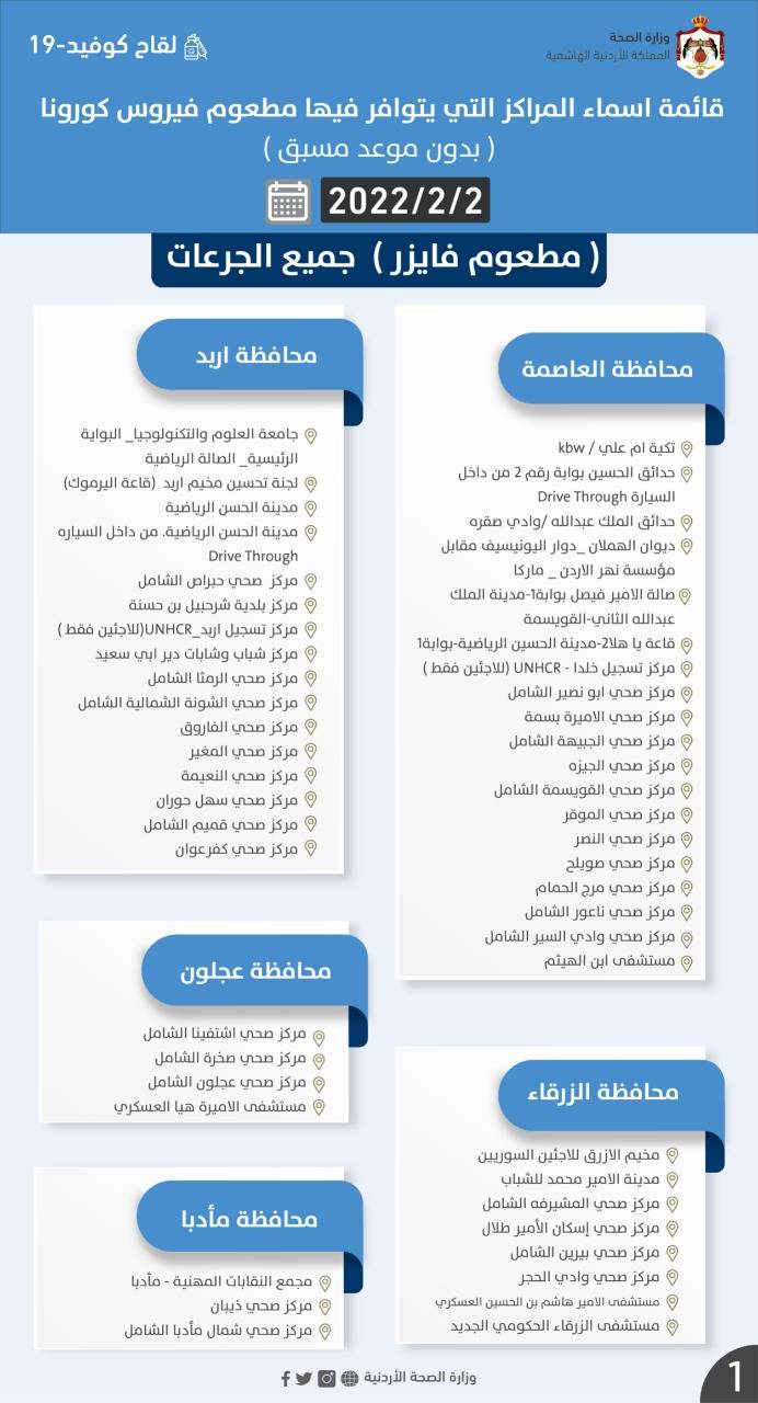 وفي منشور عبر "فيسبوك”، قالت إن المطاعيم المتوفرة هي "فايزر” و”سينوفارم”، منوهة بأن دوام مراكز المطاعيم ومراكز فحص كورونا من الساعة 8:00 صباحًا – 3:00 مساءً.