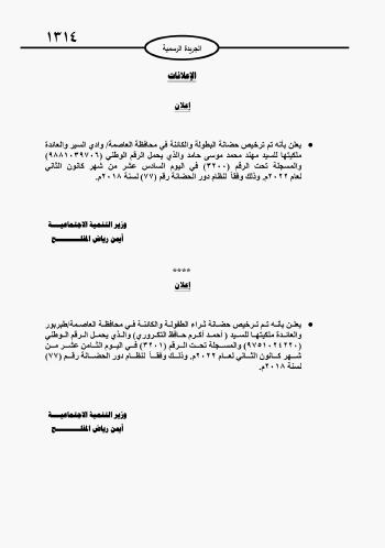 صدر إعلان في عدد الجريدة الرسمية، اليوم الثلاثاء، يُفيد بترخيص حضانتي "البطولة” و”ثراء الطفولة” في العاصمة عمان.