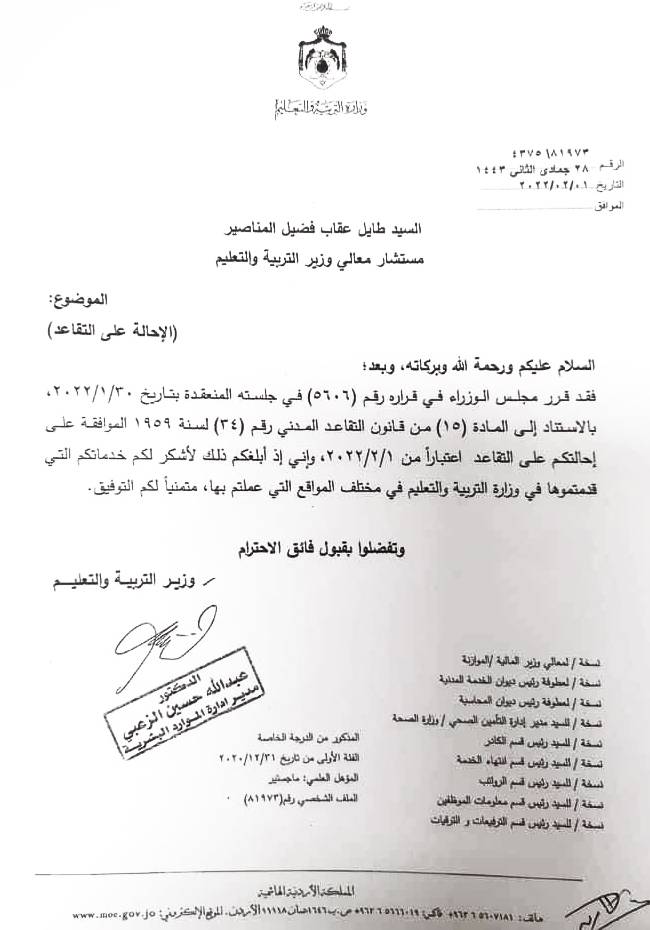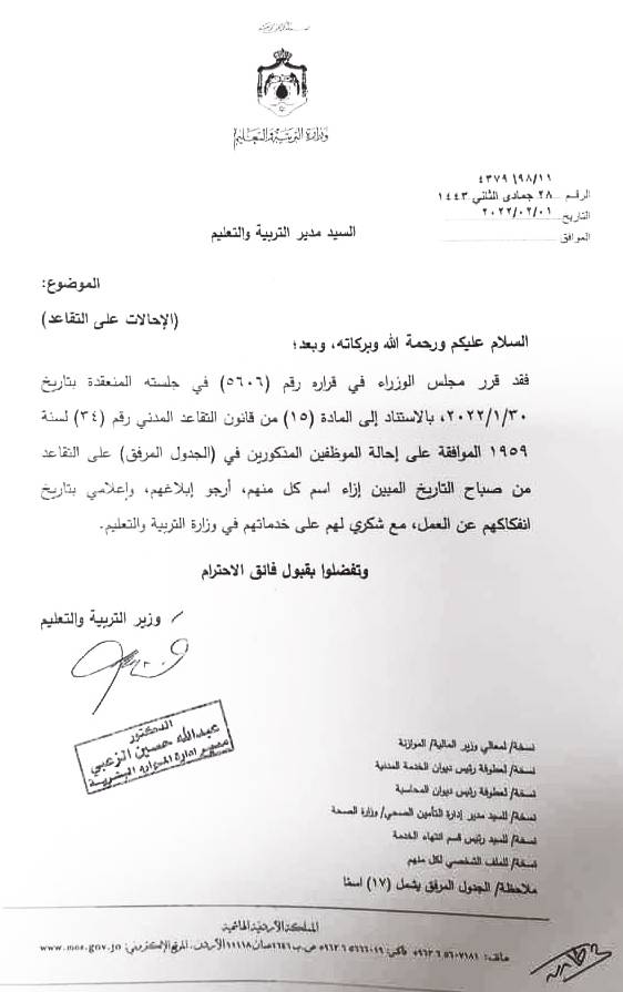 قرر مجلس الوزراء، في جلسة عقدها مؤخرا، إحالة عدد من الموظفين في وزارة التربية والتعليم على التقاعد.