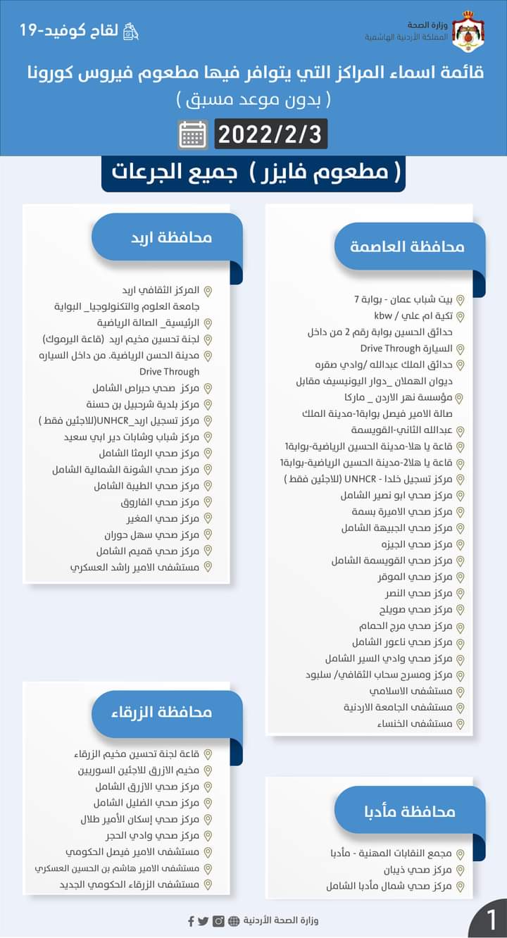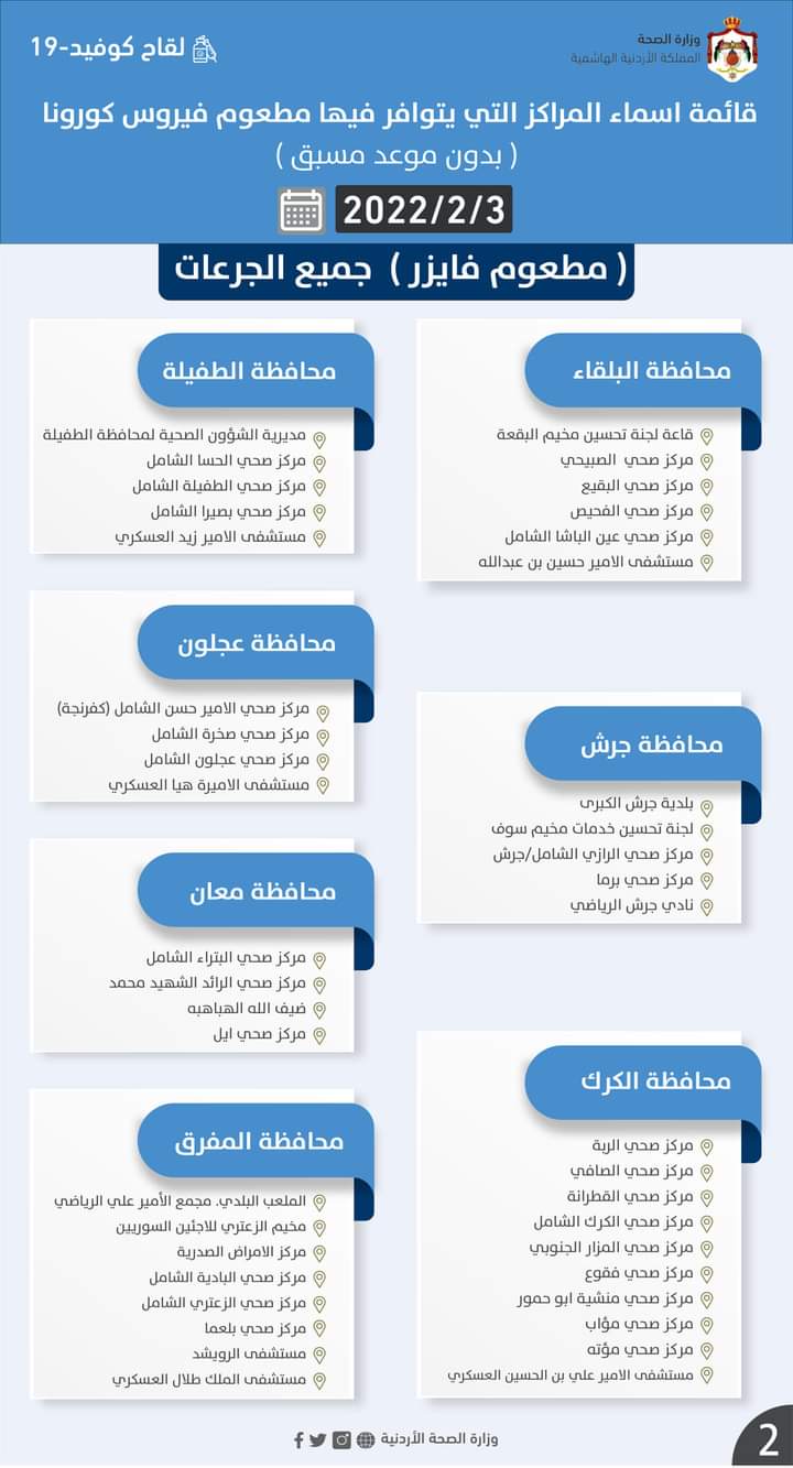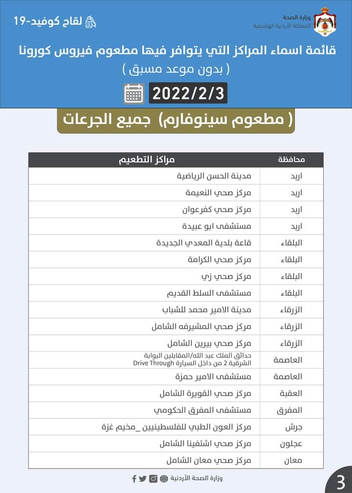 قائمة اسماء المراكز التي يتوافر فيها مطعوم فيروس كورونا (بدون موعد مسبق) #جميع_الجرعات ليوم الخميس الموافق 2022/2/3: