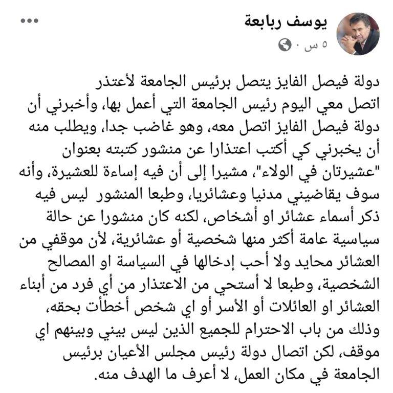وكتب ربابعة في منشور عبر صفحته على "فيسبوك”، اليوم الأربعاء، "اتصل معي اليوم رئيس الجامعة التي أعمل بها، وأخبرني أن دولة فيصل الفايز اتصل معه، وهو غاضب جدا، ويطلب منه أن يخبرني كي أكتب اعتذارا عن منشور كتبته بعنوان "عشيرتان في الولاء””.