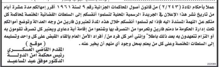 : أمهلت محكمة أمن الدولة، متهمين مدة 10 أيام لتسليم أنفسهم إلى السلطات القضائية المختصة.