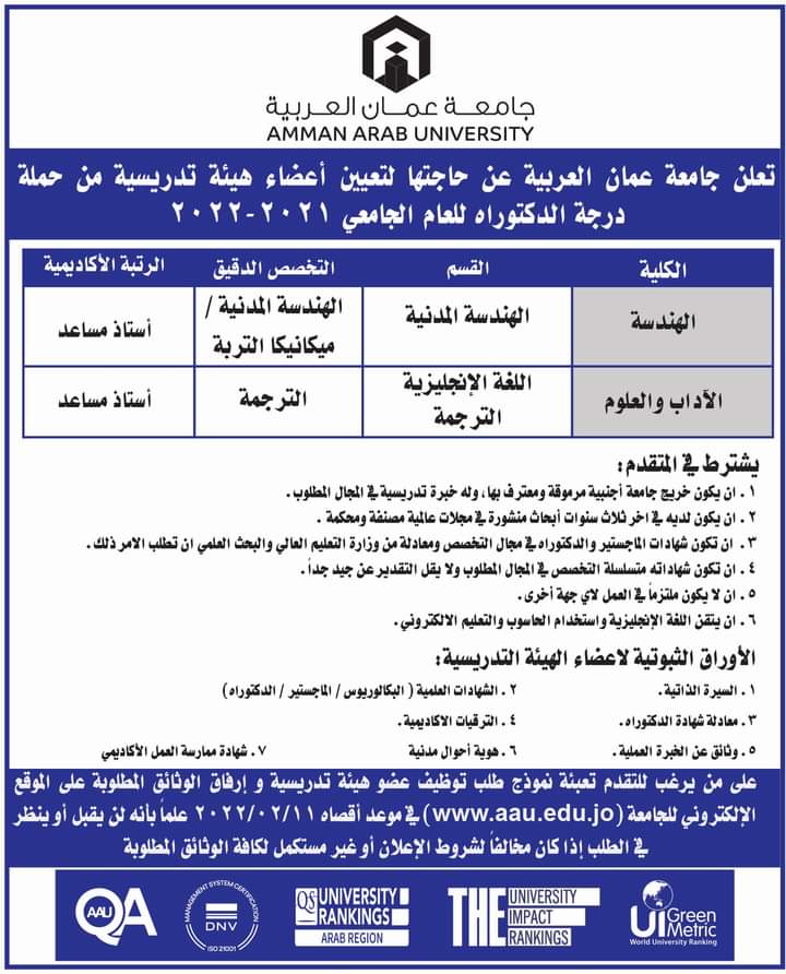 أعلنت جامعة عمان العربية عن حاجتها إلى تعيين أعضاء هيئة تدريس ، كلية الهندسة وكلية الآداب والعلوم