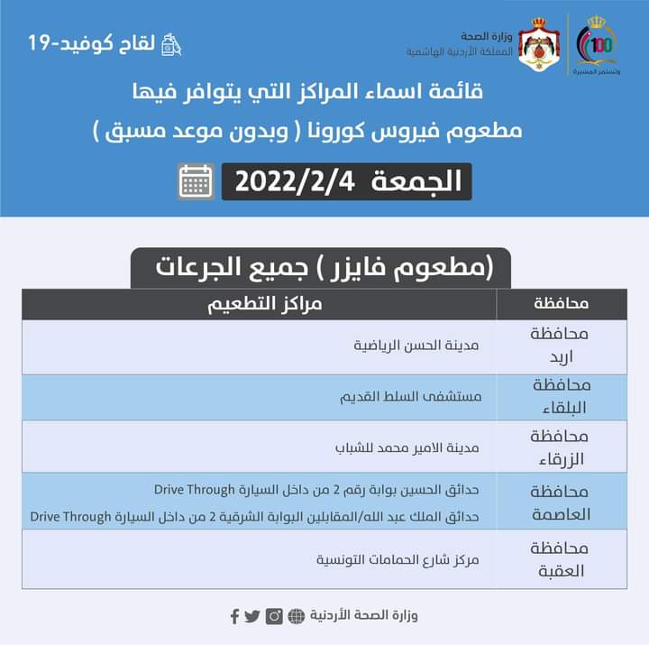 قائمة اسماء المراكز التي يتوافر فيها مطعوم فيروس كورونا (بدون موعد مسبق) #جميع_الجرعات ليوم الجمعة الموافق 2022/2/4: