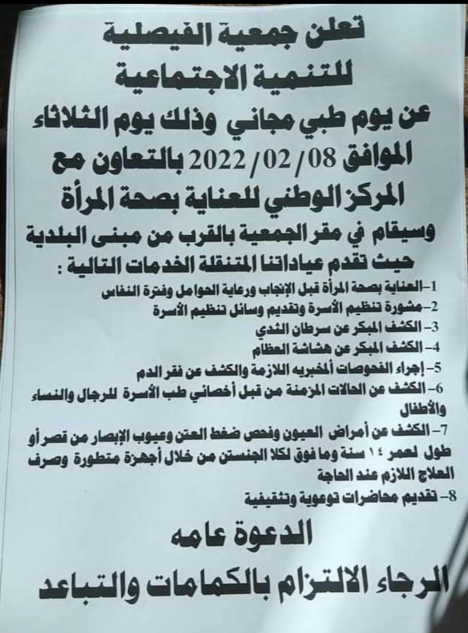 أعلنت جمعية الفيصلية للتنمية الاجتماعية بالتعاون مع المركز الوطني للعناية بصحة المرأة عن يومًا طبيبًا مجانيًا .