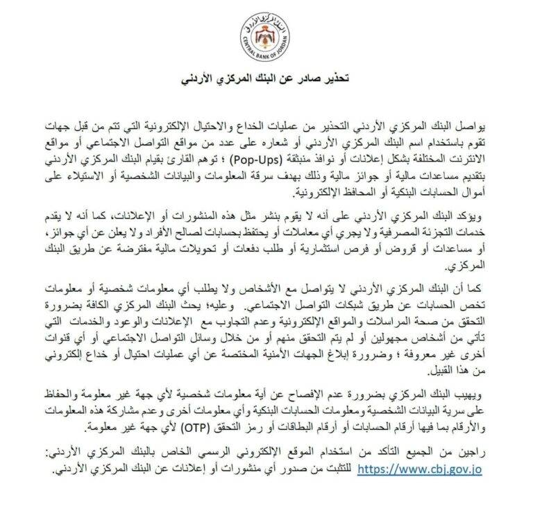 حذر البنك المركزي الأردني، في بيان صادر اليوم الجمعة، من عمليات الخداع والاحتيال الإلكتروني التي تتم باستخدام اسم البنك المركزي أو شعاره، تدّعي أنه يُقدم مساعدات أو جوائز مالية.