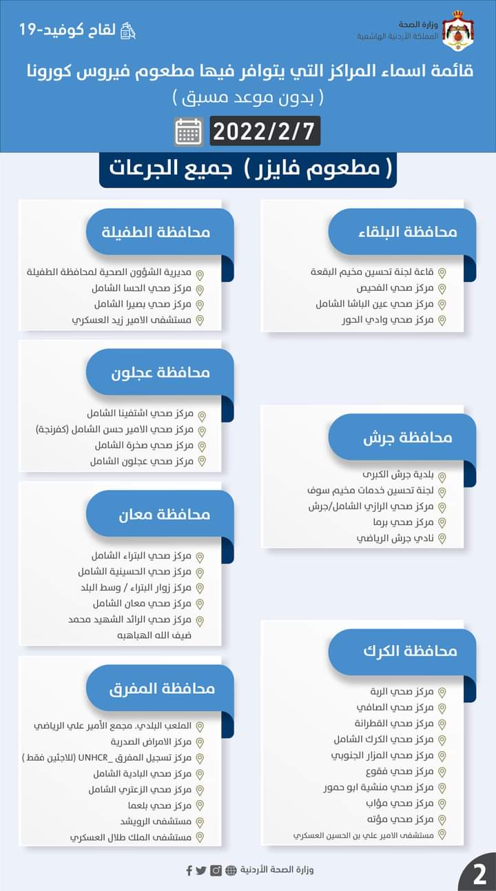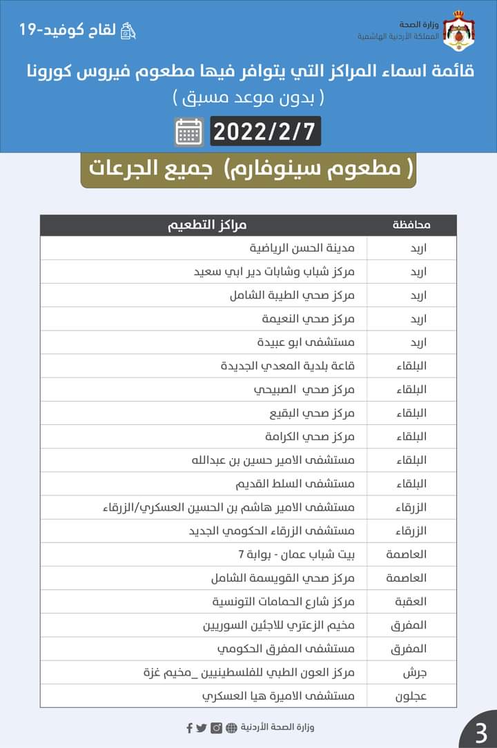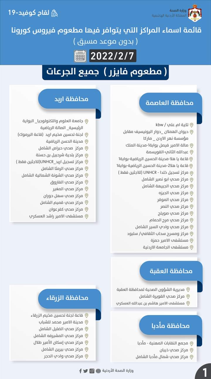 قائمة اسماء المراكز التي يتوافر فيها مطعوم فيروس كورونا (بدون موعد مسبق) #جميع_الجرعات ليوم الإثنين الموافق 2022/2/7: