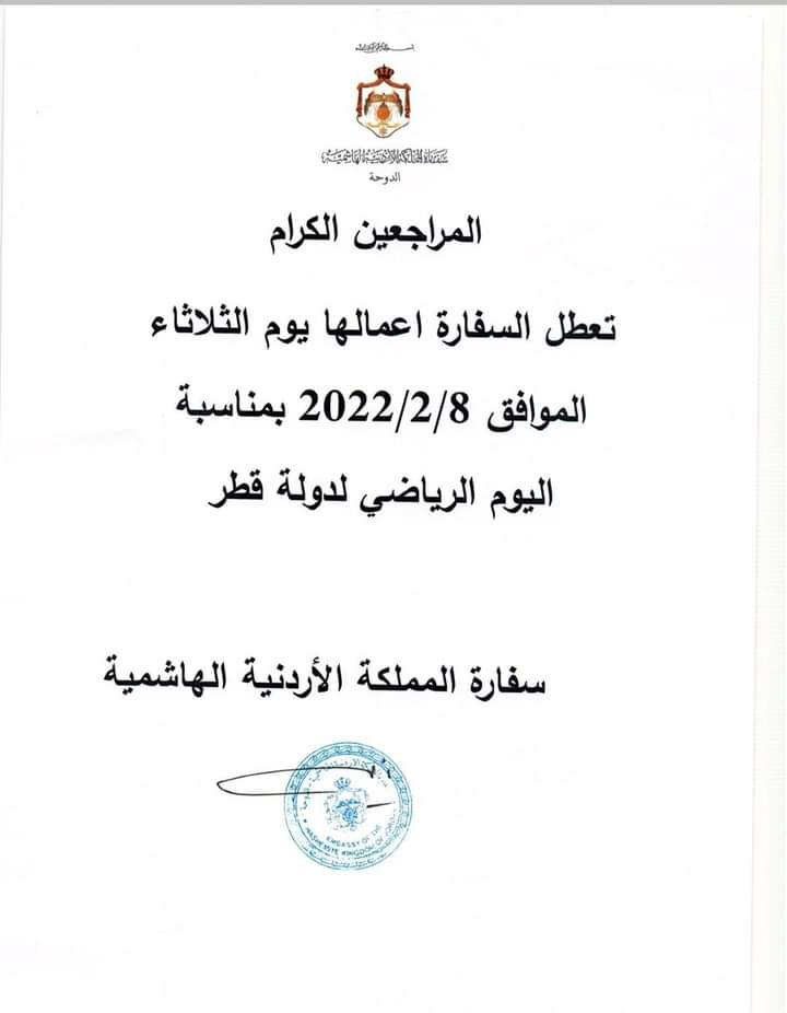 أعلنت السفارة الأردنية في قطر عن إغلاقها لليوم الثلاثاء 8/2/2022 وذلك بمناسبة اليوم الرياضي لدولة قطر الشقيقة.