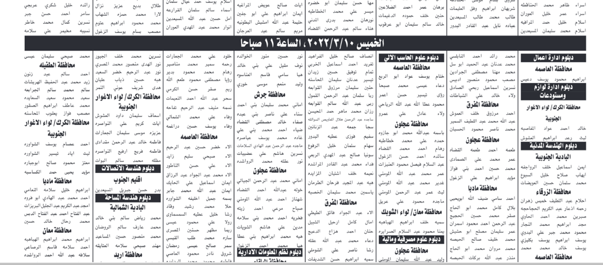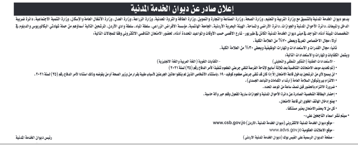 ويعقد الامتحان التنافسي، وفق إعلان نشر في ديوان الخدمة المدنية ، حسب الاوقات والمواعيد المحددة ادناه في تمام الساعة 11 صباحا، في مبنى ديوان الخدمة المدنية.