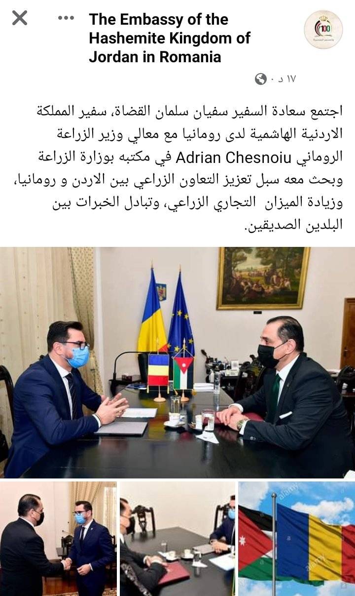 نيروز الإخبارية : اجتمع السفير سفيان سلمان القضاة، سفير المملكة الاردنية الهاشمية لدى رومانيا مع معالي وزير الزراعة الروماني Adrian Chesnoiu في مكتبه بوزارة الزراعة وبحث معه سبل تعزيز التعاون الزراعي بين الاردن و رومانيا، وزيادة الميزان  التجاري الزراعي، وتبادل الخبرات بين البلدين الصديقين.