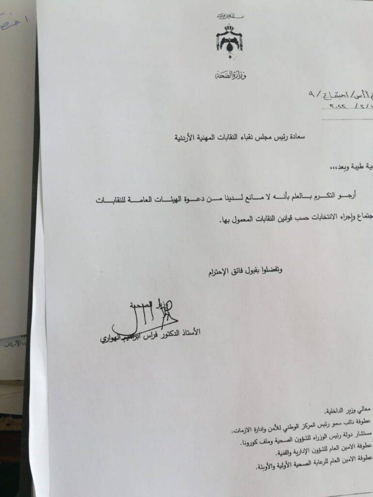 الصحة الأردنية لا تمانع إجراء انتخابات النقابات