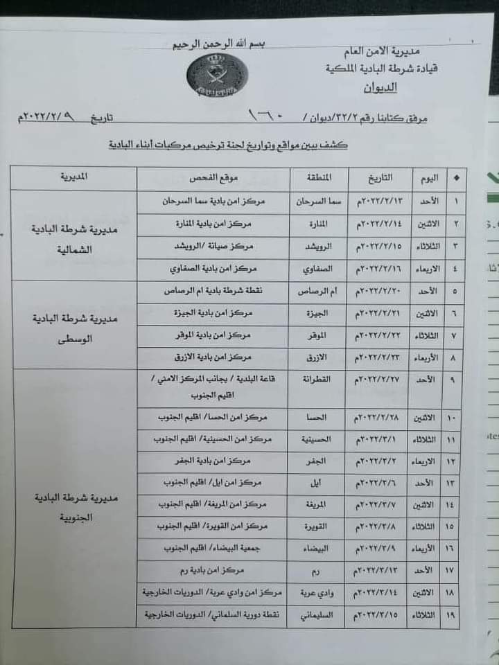 أعلنت قيادة شرطة البادية الملكية، برنامج ترخيص سيارات ابناء البادية لشهر تشرين الثاني المقبل وذلك بالتنسيق مع ادارة ترخيص السواقيين والمركبات.