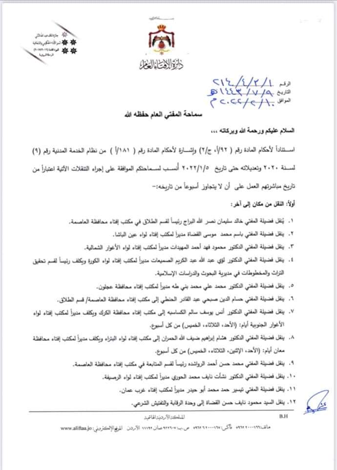 وبين الكتاب ،أنه استنادًا لأحكام المادة رقم (92/أ،ج/٢) وإشارة لأحكام المادة رقم (181/أ) من نظام الخدمة المدنية رقم (9) لسنة 2020 وتعديلاته حتى تاريخ 2022/1/5 قد نسب بنقل فضيلة المفتي الدكتور نشات نايف الحوري ،مديرًا لمكتب افتاء الرصيفة اعتبارًا من تاريخ مباشرته العمل .