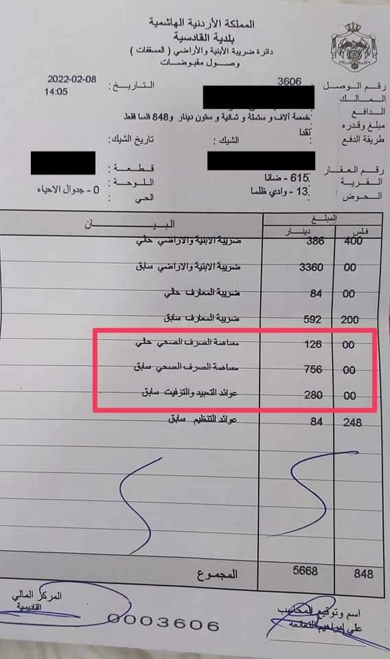 وشمل الوصل، الذي اطلعت عليه "أخبار الأردن”، على عدة بنود بينها (مساهمة الصرف الصحي حالي، مساهمة الصرف الصحي سابق، عوائد التعبيد والتزفيت سابق).