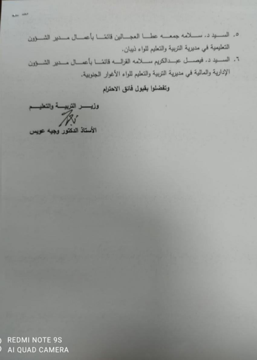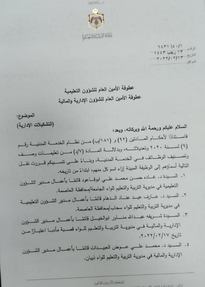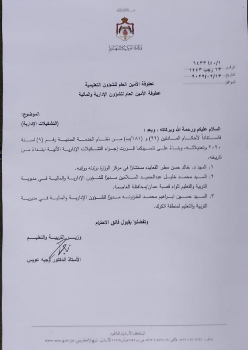 قرر وزير التربية والتعليم الدكتور وجيه عويس اجراء عدد من التشكيلات الإدارية في وزارة التربية والتعليم.