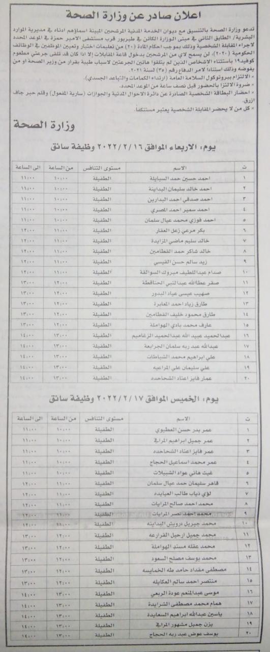 وزارة الصحة تدعو مرشحين للتعيين لإجراء مقابلات شخصية ...أسماء