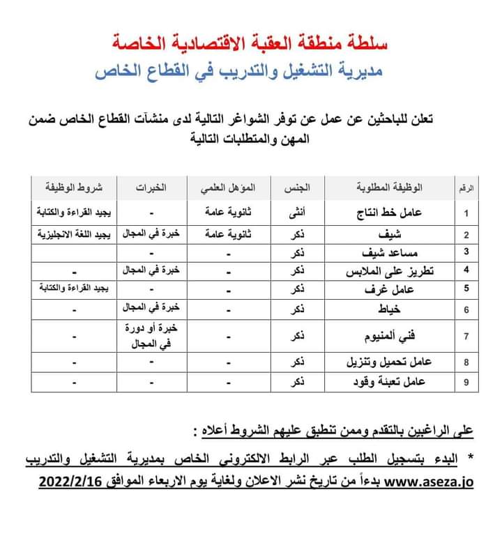 : اعلنت سلطة منطقة العقبة الاقتصادية الخاصة ، الاثنين، من خلال مديرية التدريب والتشغيل في القطاع الخاص عن فرص عمل ضمن المهن والمتطلبات التالية :