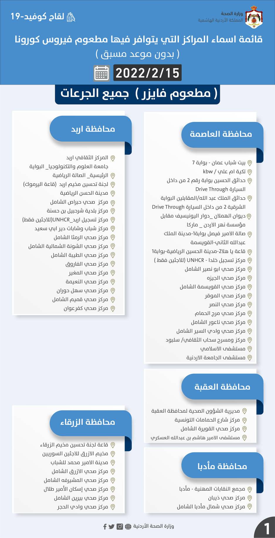 أعلنت وزارة الصحة عن قائمة أسماء المراكز التي يتوافر فيها مطعوم فيروس كورونا (بدون موعد مسبق) وبجميع الجرعات ليوم الثلاثاء 15/2/2022.