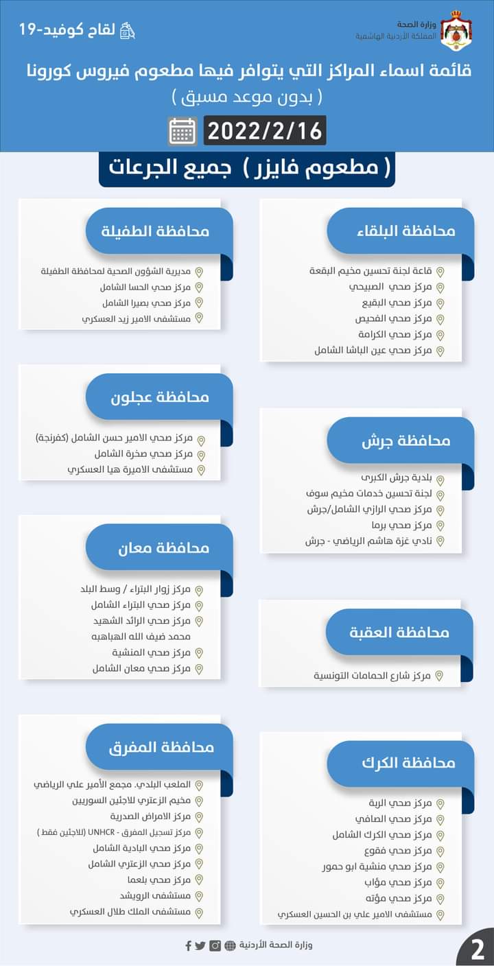 وفي منشور عبر "فيسبوك"، قالت إن المطاعيم المتوفرة هي "فايزر" و"سينوفارم"، منوهة بأن دوام مراكز المطاعيم ومراكز فحص كورونا من الساعة 8:00 صباحًا – 3:00 مساءً.