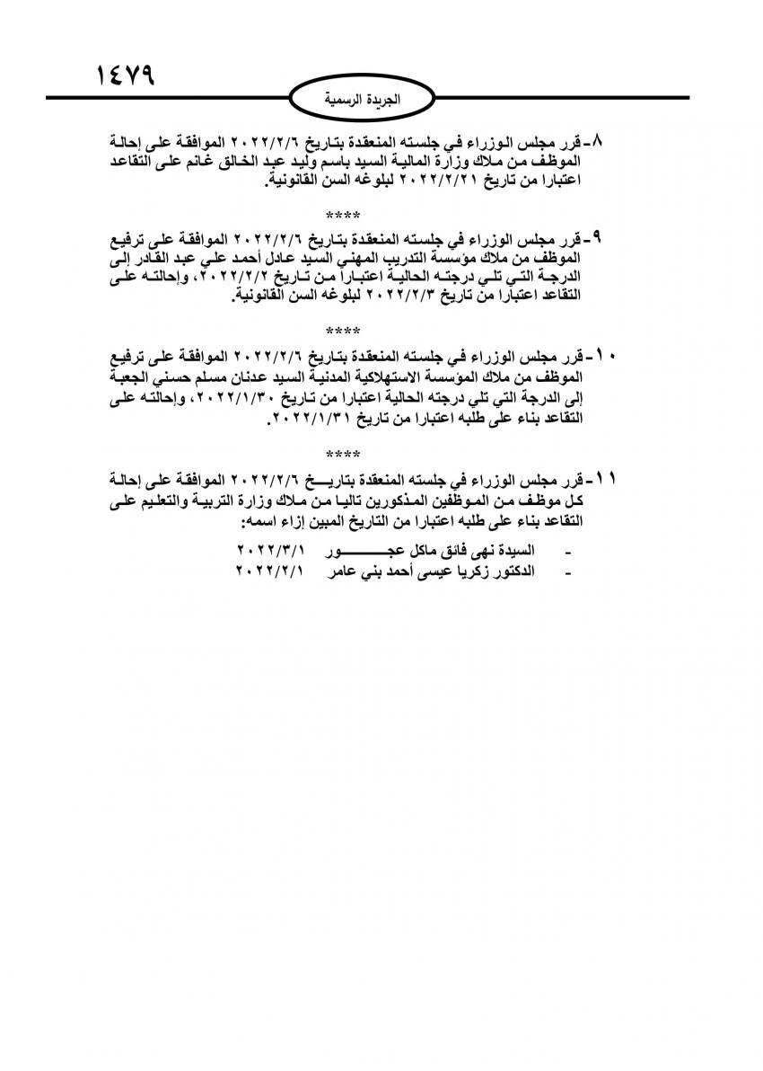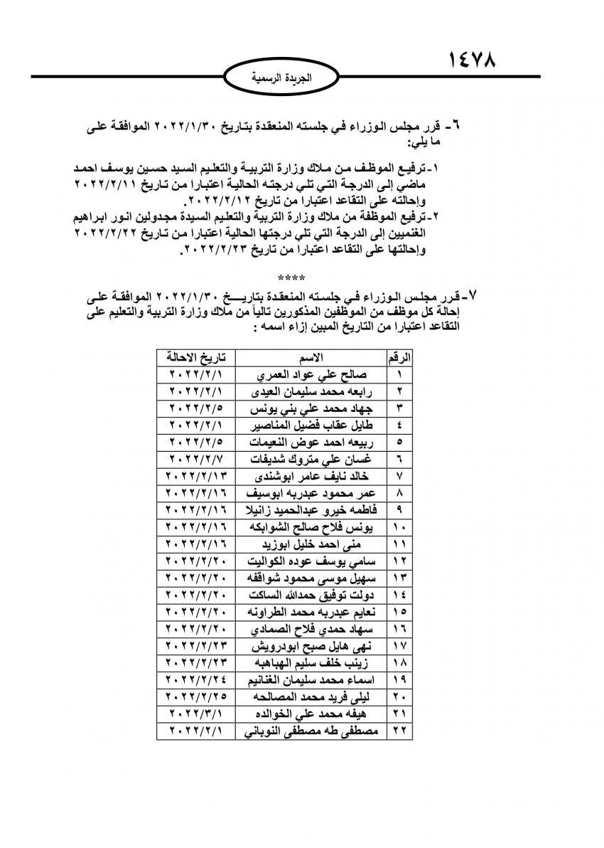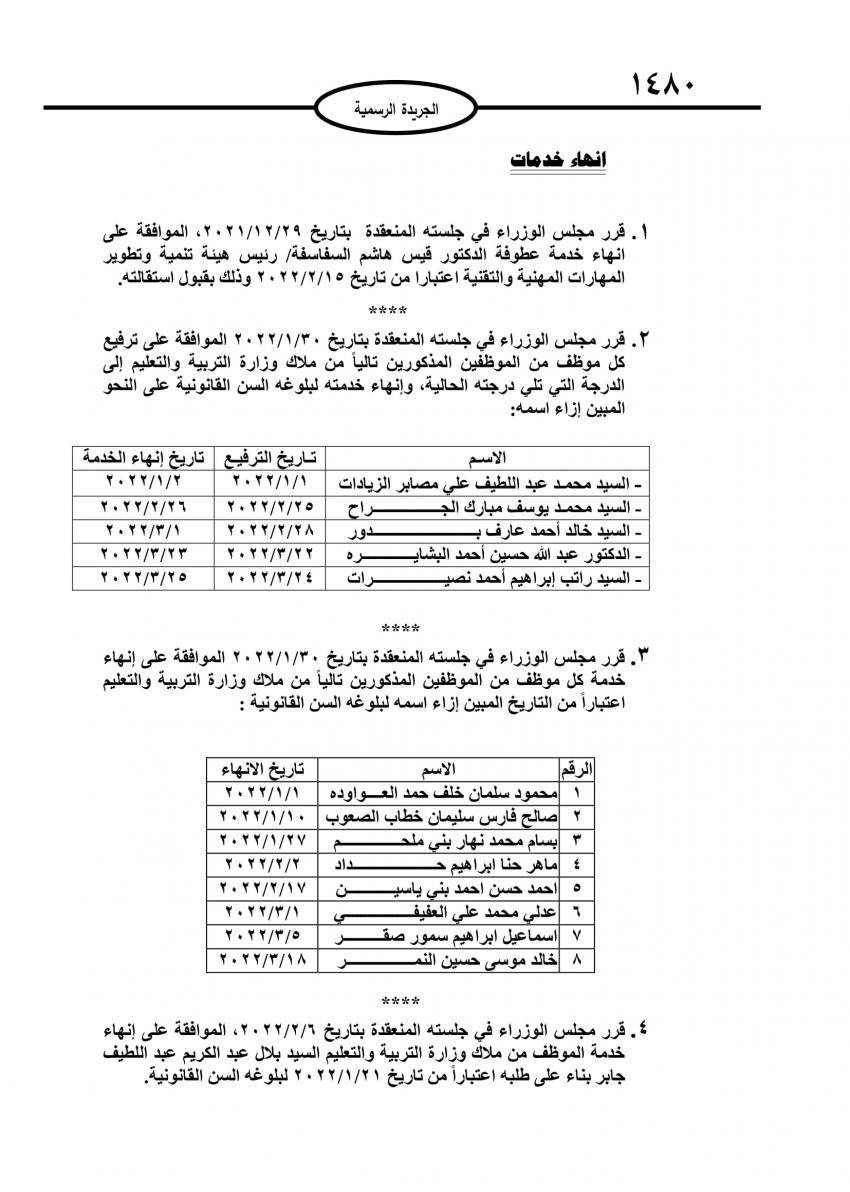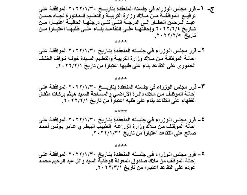 : صدر في عدد الجريدة الرسمية اليوم الاربعاء قرارات احالة موظفين حكوميين إلى التقاعد، وانهاء خدمات اخرين.