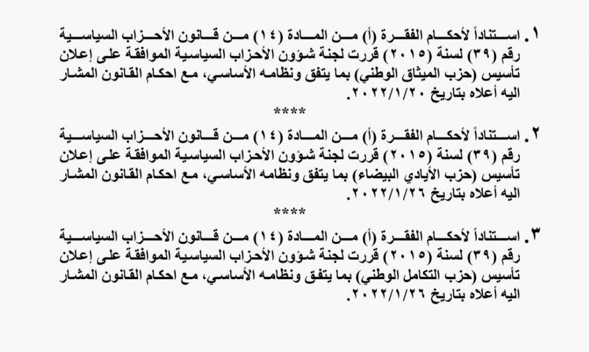 ووفق ما جاء في الجريدة الرسمية الاحزاب هي: (الميثاق الوطني)، و(الأيادي البيضاء)، و(التكامل الوطني) وذلك استنادا الى أحكام الفقرة أ من المادة 14 من قانون الأحزاب السياسية رقم 39 لسنة 2015 .