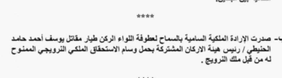 صدرت الارادة الملكية السامية بالسماح لرئيس هيئة الاركان المشتركة اللواء الركن طيار مقاتل يوسف احمد الحنيطي، بحمل وسام الاستحقاق الملكي النرويجي الممنوح له من قبل ملك النرويج.