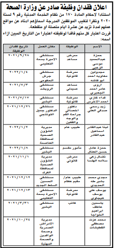 بالأسماء ... وزارة الصحة تعلن فقدان وظائف