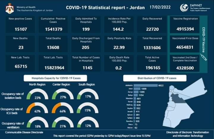 سجل في الأردن 23 وفاة بين المصابين بفيروس كورونا و15107 إصابة جديدة بالوباء ليرتفع إجمالي عدد الإصابات منذ بدء الجائحة 1541379 إصابة، وفق الموجز الصادر عن وزارة الصحة الخميس.