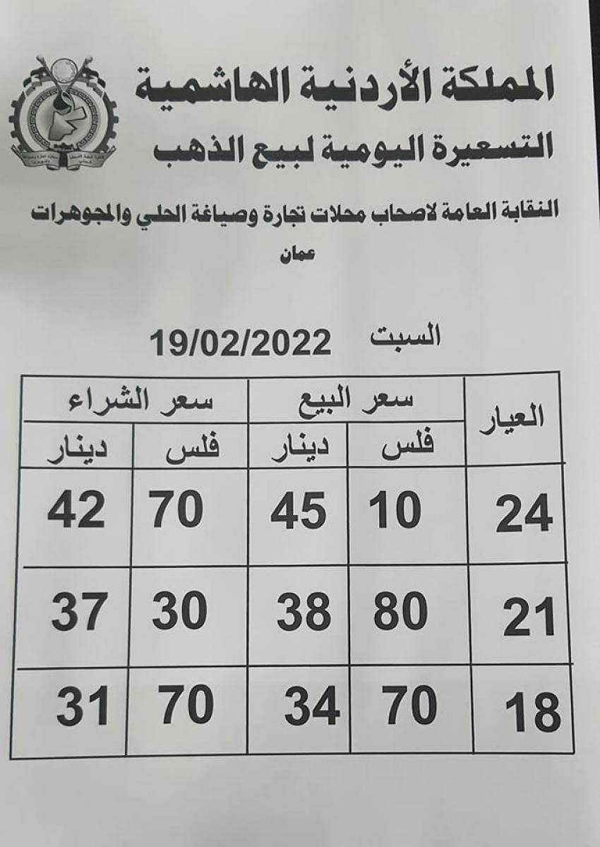 وبلغ سعر غرام الذهب عيار 21 الأكثر طلبا في السوق المحلية 38.80 ديناراً، لغايات شراء المواطنين من محلات الصاغة، مقابل 37.30 دينارا لغايات البيع.