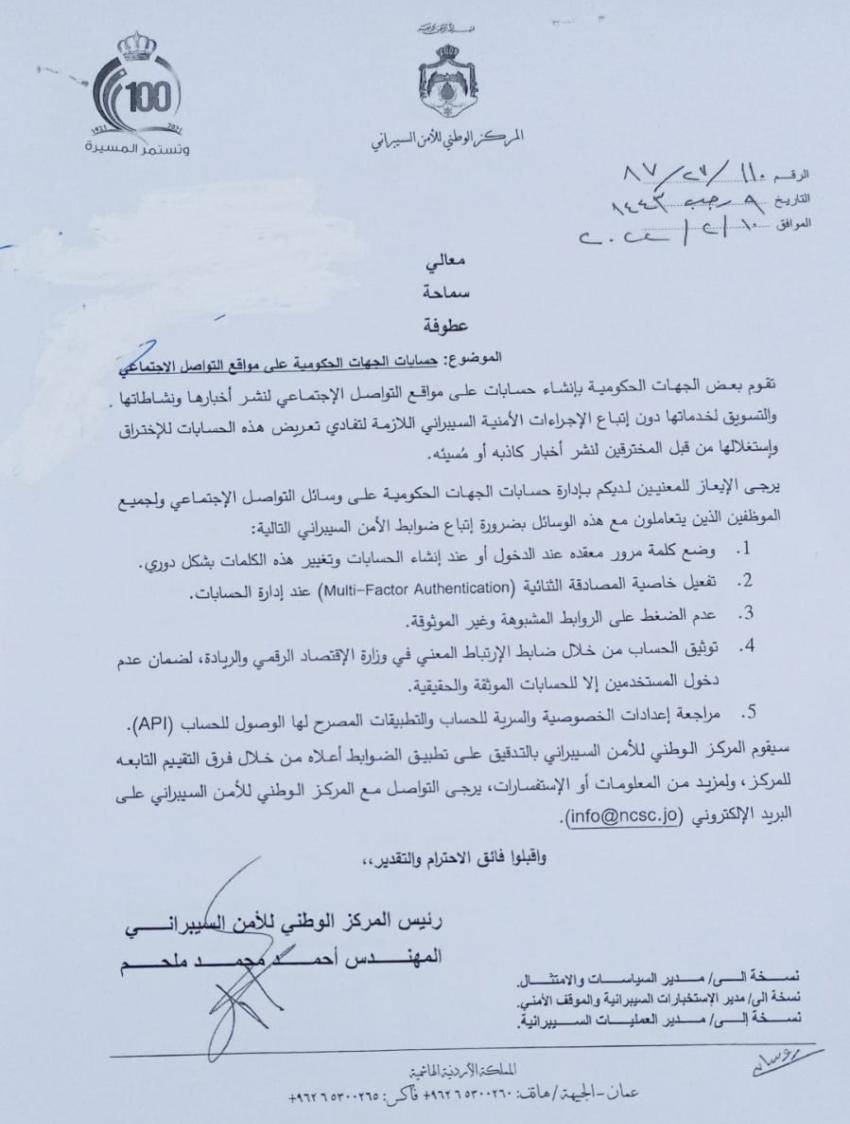 واوعز كريشان في كتاب وجهه الى رؤساء لجان البلديات ومدراء الشؤون البلدية ومجالس الخدمات المشتركة للمعنيين لديهم بادارة الحسابات على وسائل التواصل الاجتماعي والموظفين الذين يتعاملون مع هذه الوسائل بضرورة اتباع ضوابط الامن السيبراني حيث سيقوم بالتدقيق على تطبيق الضوابط من خلال فرق التقييم التابعة للمركز.
