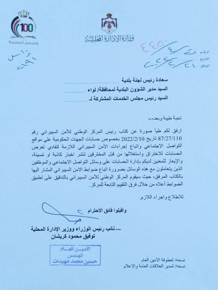 نيروز الإخبارية : ينال المعاني - أكد نائب رئيس الوزراء وزير الادارة المحلية توفيق كريشان على اتباع اجراءات الامن السيبراني اللازمة لتفادي تعرض الحسابات للاختراق واستغلالها من قبل المخترقين لنشر اخبار كاذبة او مسيئة.